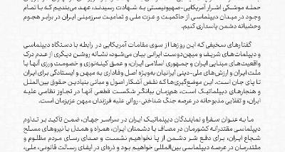 وإنني، إلى جانب جميع دبلوماسيي الجمهورية الإسلامية الإيرانية، بمن فيهم السفراء والقائمون بالأعمال والقناصل العامون ورؤساء بعثات بلادنا في الخارج، وكذلك نواب وقيادات وموظفو وزارة الخارجية داخل البلاد، نعلن البيعة للقائد الثالث للثورة الإسلامية، ونعاهد على ألا ندخر جهدًا في الدفاع عن حقوق الشعب الإيراني العظيم، وتعزيز المصالح والأمن الوطنيين، وتحقيق الأهداف العليا للثورة الإسلامية الإيرانية.
